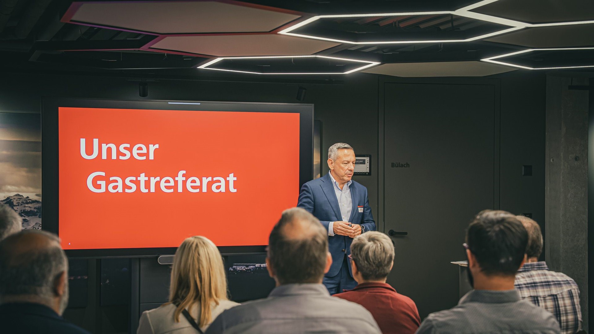 Nach diesem inspirierenden Rundgang eröffnete Leasing-Experte Samuel Engel von Raiffeisen Schweiz den Abend mit einem praxisnahen und aufschlussreichen Fachreferat. Er zeigte eindrücklich, dass Leasing weit mehr ist als Zahlen und Verträge: Mit cleveren Beispielen, praktischen Tipps und Einblicken aus der Praxis wurde deutlich, wie Unternehmen mit dem richtigen Leasing-Partner strategisch investieren und nachhaltig wachsen können.